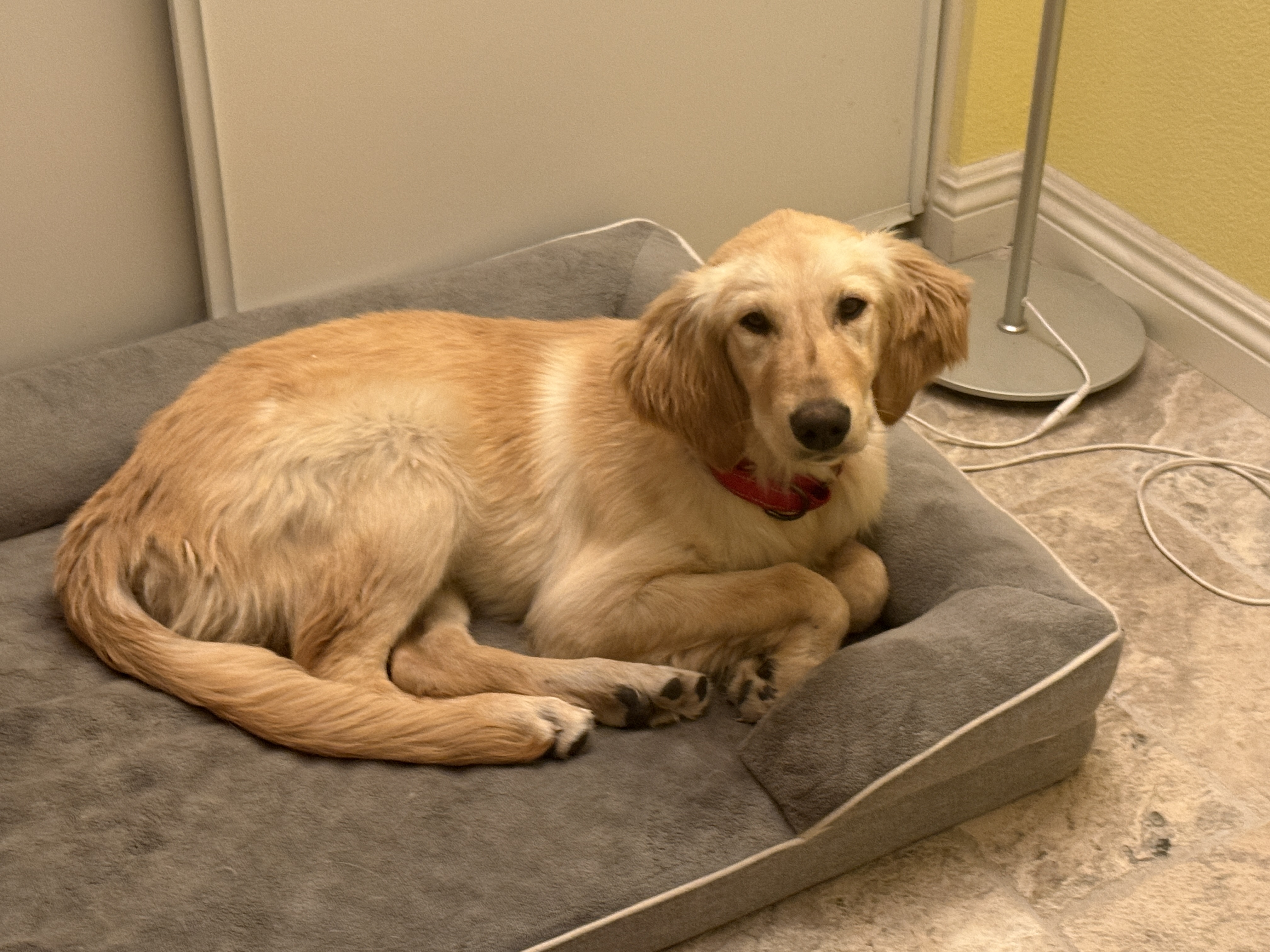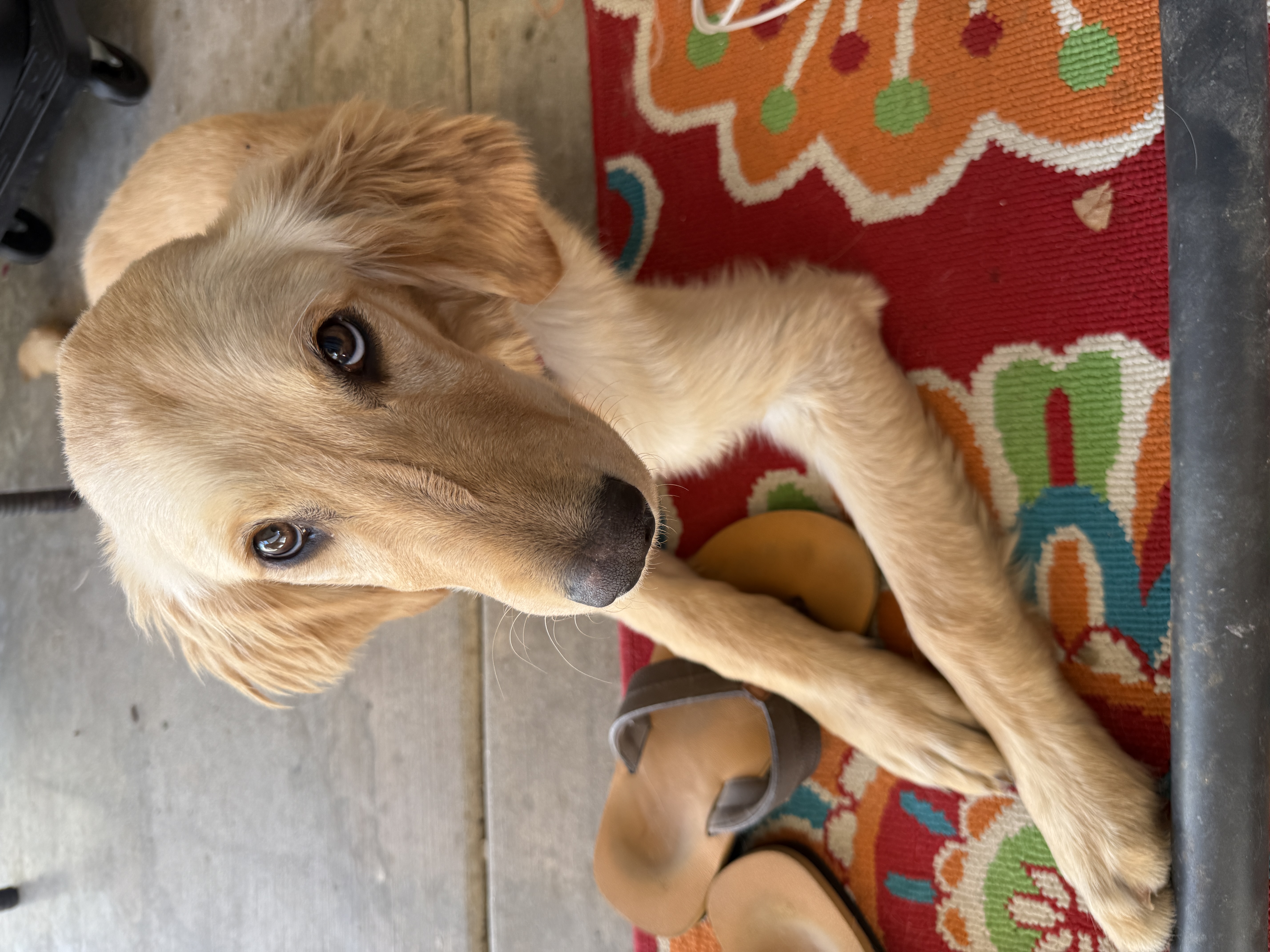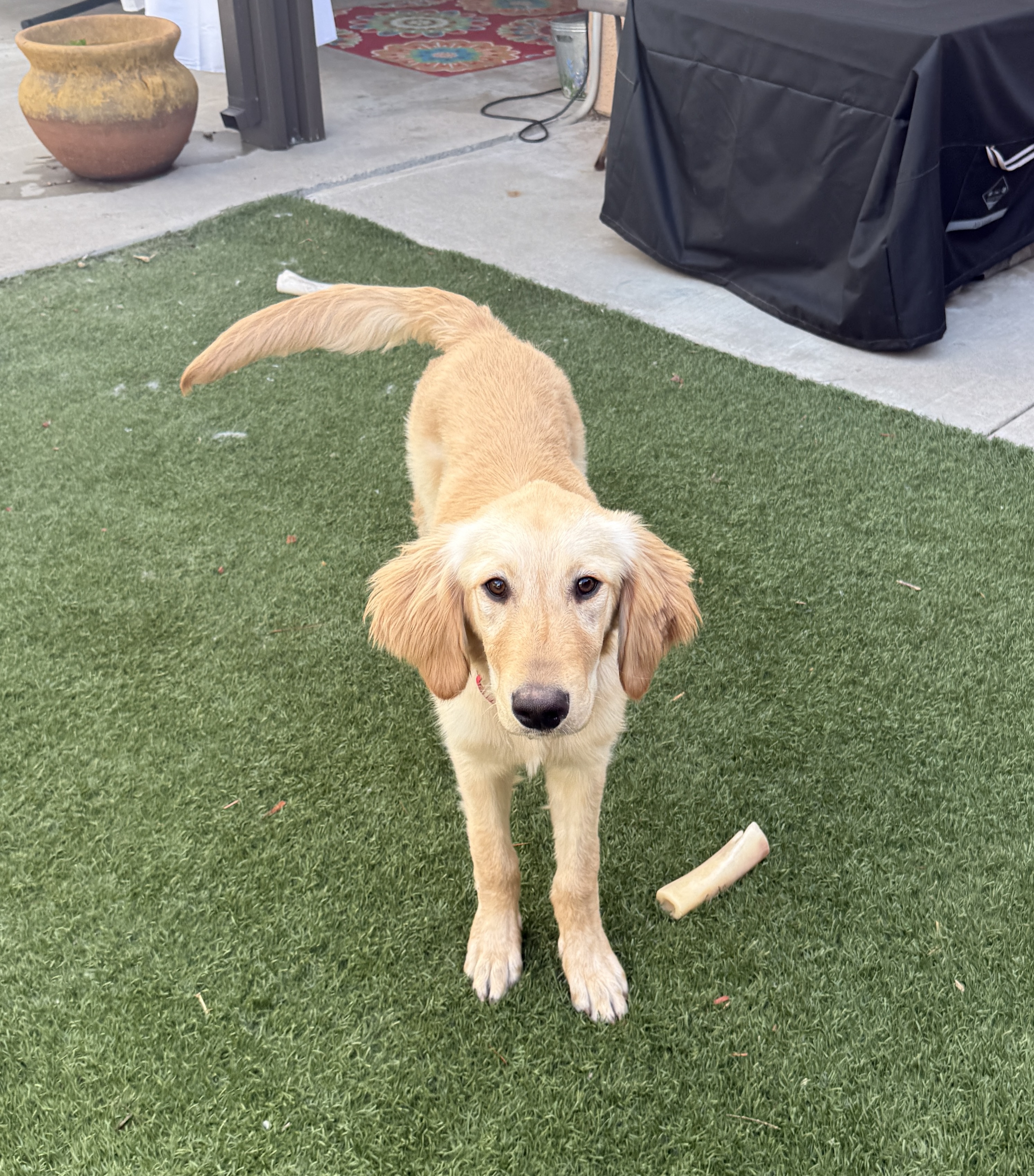 This little bundle of puppy joy is Barley, an approximately 6-month old Golden Retriever. Barley was found as a stray and ended up at a local shelter. He was nothing but skin and bones, and covered with sticky oil or sap all over his fur. Thankfully, he loves food so he is putting on weight now he is being cared for and fed nutritious food. After a lovely bath and good brush he is back to looking and smelling like the puppy he is! He is trying really, really hard now to grow into his ears. :)