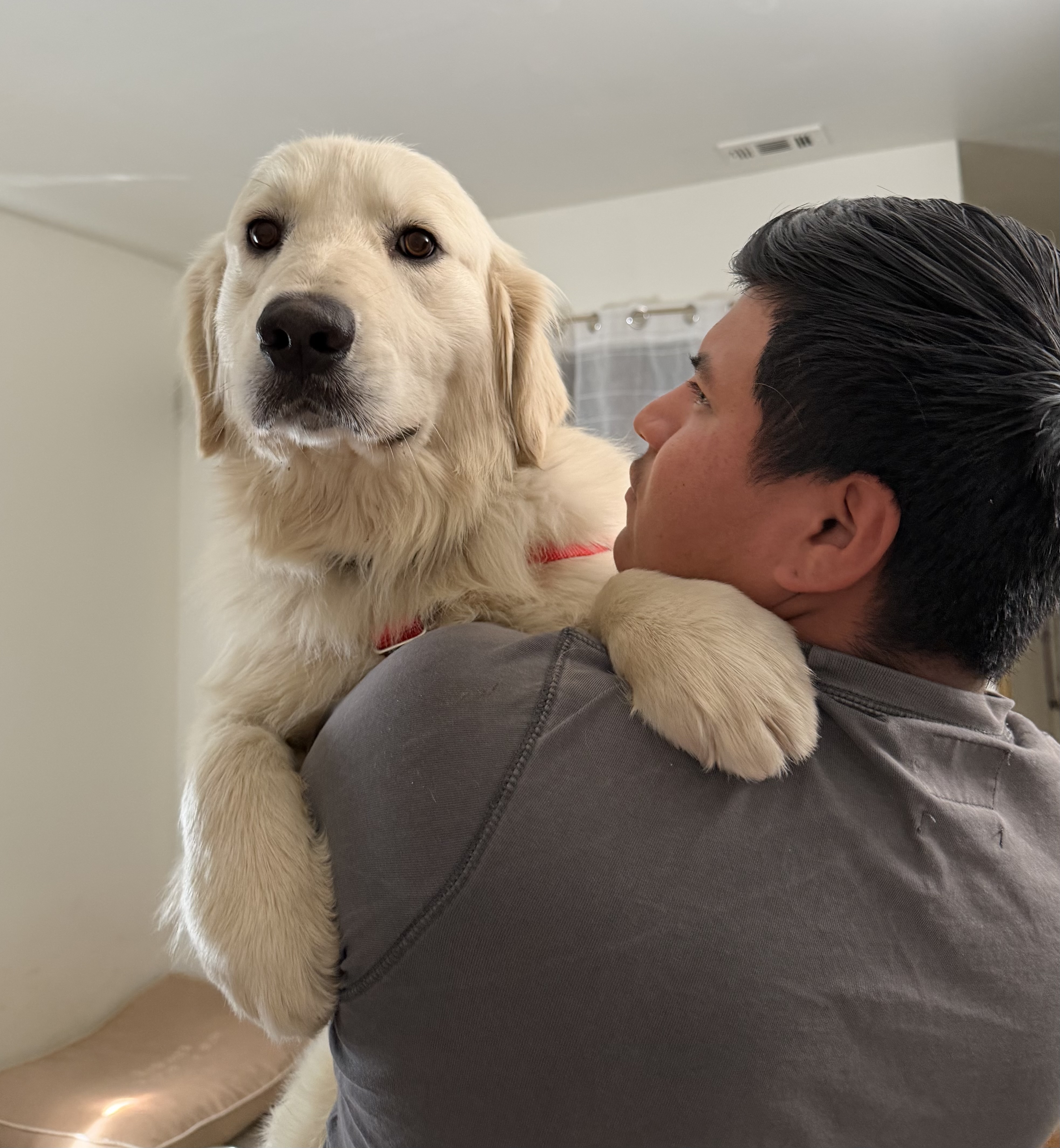 He is incredibly affectionate and thrives on connection. His favorite place is right next to you on the couch, resting his head in your lap while soaking up ear rubs and head scratches. He may still cower just a little when you first reach to pet him, but once he realizes it’s love coming his way, he melts into it.
